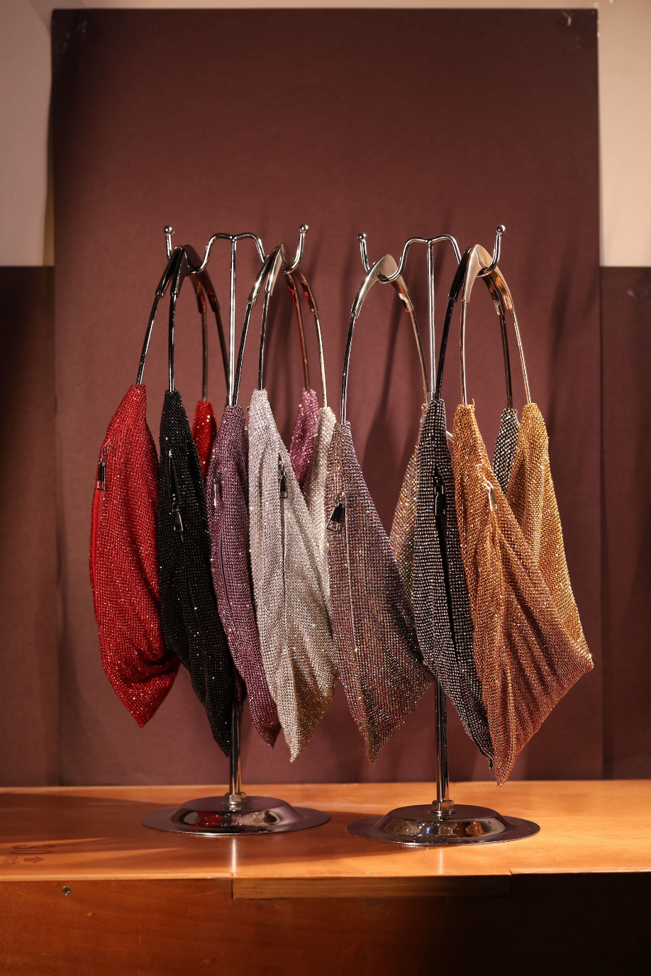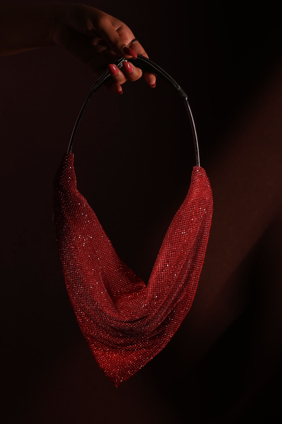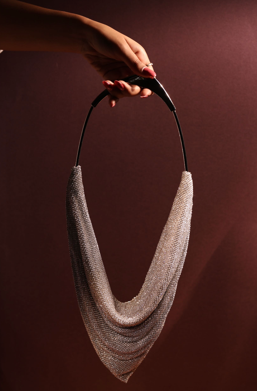 This sculptural handbag is a statement of understated glamour. Designed with a fluid, draped silhouette, it features a cascading metallic texture that catches the light beautifully with every movement. The soft folds create an elegant, jewelry-like effect, making it as much an accessory as it is a piece of art. Finished with a sleek, structured handle, this bag balances modern design with timeless sophistication. Perfect for evening soirées, cocktail events, or elevating a minimal outfit, it adds effortless drama without overpowering your look.