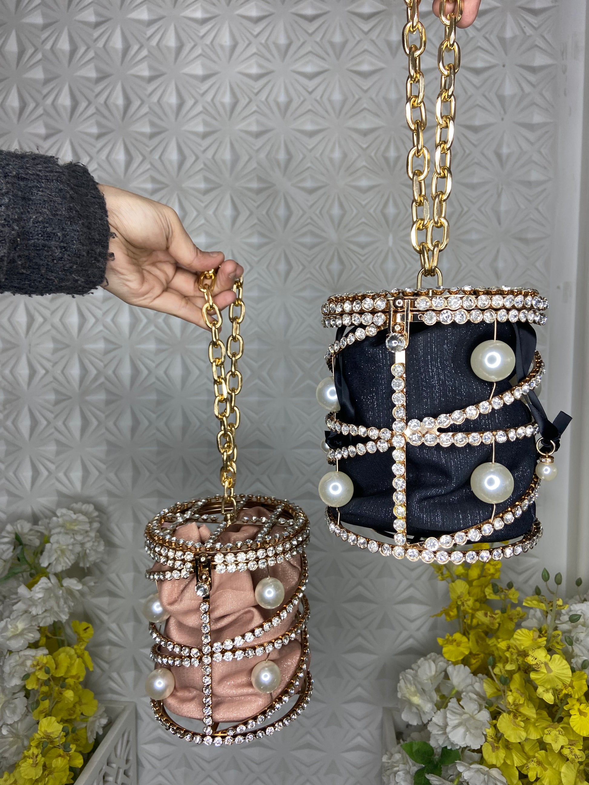 | CAGE LOCK BAG WITH THE CHAIN HANDLE MAKING IT LOOK PERFECT WITH THE PEARL DETAILS AND SMALL POUCH TO COMPLIMENT IT WITH IT. |