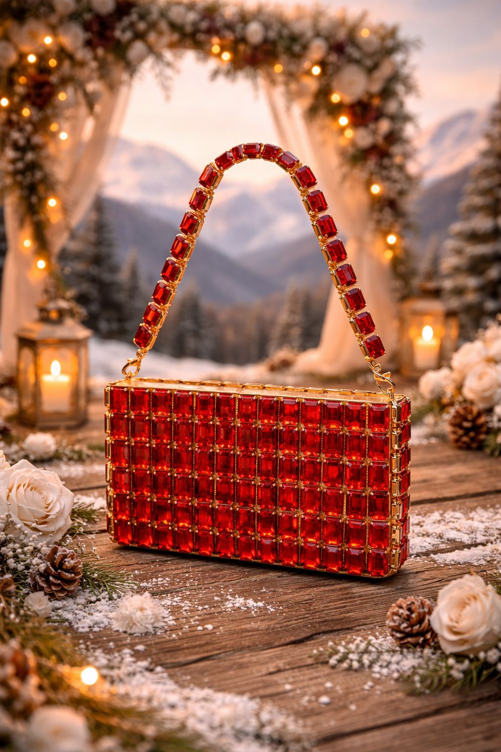 A dazzling crystal handbag crafted with iridescent stones in a sleek geometric design. Elegant and radiant, it’s the perfect statement accessory for weddings, festive celebrations, and glamorous evenings.